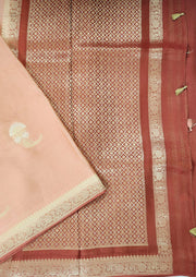 This grey & red Tana Chadarang Ilkal saree features fine grid weaving, traditional temple zari border, and a luxurious silk pallu.